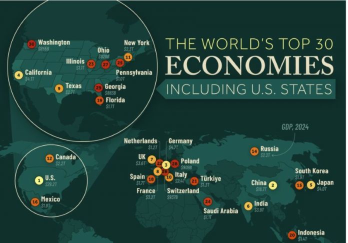 최근 연방경제분석국(BEA)과 국제통화기금(IMF)이 발표한 2024년 국내총생산(GDP) 자료에 따르면, 전 세계 주요 30대 경제권에 미국 내 9개 주가 이름을 올린 것으로 나타났다.